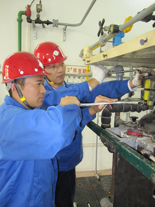 作为重大危险源危险设备整体检修保养工作的一部分,该水厂在去年底就对蒸发器的保养制定了详细的计划,一方面通过设备部联系设备供应商进行技术指导、组织备品备件,另一方面协调机电维修中心及早落实人员和检修时间、谋划好检修时的生产调度工作。在检修过程中,检修人员按照相关步骤和要求,严谨有序展开维护保养,把蒸发器的各个部件及附属管线一一拆卸,清洗、干燥蒸发筒内壁,清除加热水箱积垢,疏通加氯管线和过滤器,更换阳极保护镁棒,修理故障零部件……仔细排查,有效消除设备隐患。当天,各部门相互配合、紧密协作,从早上一直奋战到晚上六点多钟,圆满完成了蒸发器的保养任务。