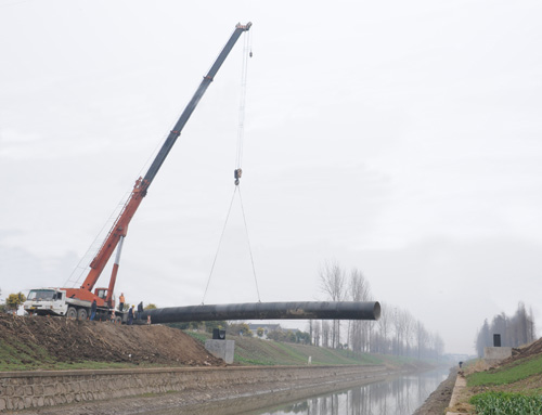 窑港河DN1400过河管是整个管道施工中的重点和难点,管道跨度近30米,钢管整体重量达11吨,且安装地点两岸地质松软,给吊装工作增加了难度。对此,市政公司不等不靠,积极作为,多次组织专业技术人员和业务能手深入现场,对周围环境进行勘察,研究并制定了一套详细的吊装专业操作方案,为安全保质完成吊装任务提供了可靠保证。施工当天,在场工作人员各司其职,配合默契,随着现场总指挥的一声令下,大型吊车缓缓伸出巨大的手臂,通过精准指挥、精细操作,最终管道一次性准确地吊至预定位置。
