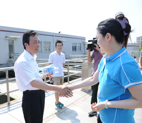 蒋书记一行走访视察了平流沉淀池、V型滤池等自来水生产运行环节,与正在V型滤池上进行冲洗作业的工作人员一一亲切握手,向他们送上了矿泉水、毛巾等消暑用品,并要求供水部门严阵以待,排查安全隐患,采取有针对性的措施,继续提高供水质量,保障供水安全,确保万无一失,不断提高市民满意度。