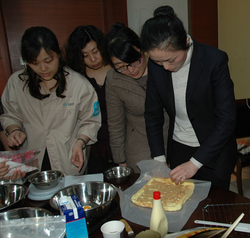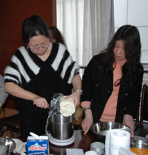接下来,我们再来说说做蛋糕的现场情况吧,只见不大的一间包厢内挤满了争相学习的女员工,她们边看着老师的动作边自己琢磨着。这看似很简单的一个过程,然而却有一套很细作的程序,打蛋、搅拌面粉等每一个步骤都不能松懈,都要很用心地去操作、去完成。于是,大家分工合作、齐心协力,忙得不亦乐乎,整个食堂都笼罩在欢乐的气氛中。而在我们这些女员工之中不乏“大师级”的人物,如夏向荣、梅晴等,做起蛋糕来很是得心应手。