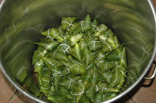 挑选3-4张芦苇叶交错叠开,将叶子围成圆锥状,放进大米花生,包盖圆锥口,用手攥出棱角,再拿一张粽叶包裹住露出的口子,用绳子扎紧,一个粽子就完成了。看了几次基本掌握步骤,大家也跃跃欲试,可实践往往没有想象的那么简单,米装得太松裹不紧,米装得太多或者压得太紧又容易把粽叶弄破,好不容易把粽叶包好了,最后封口又是一道难关,捆绑时手稍微一松粽子就散开了。“如果今年再学不会又要等下次活动啦,这次一定要成功!”有些员工已不是第一次参加,或许她们包的并不好,但她们那股认真、执着的劲头值得赞扬。随着大家的“埋头苦干”,粽叶渐渐减少,桶里满满地堆起大家的“心意”。
