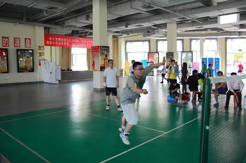比赛当天,参赛的、不参赛的员工就早早地来到体育中心,换上轻便运动装的参赛队员更是摇身一变成了活力四射的运动员。本次友谊赛分为男子单打、男子双打、女子单打、混双4个项目,采取三局两胜淘汰制,先得21分为胜者。