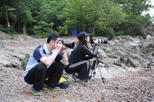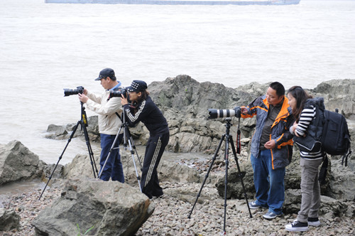6月2日,摄影小组部分成员一早来到鹅鼻嘴公园,拍摄水流。在长江边大家或蹬或站或架起三脚架,拍摄不同水流的状态,即慢速拍摄,一般情况下的平原河流,采用三脚架,速度在1/4秒以下进行拍摄,图片的水流具有如纱如雾的梦幻效果。在天气晴好的阳光下拍摄水流,如果使用更慢的速度,需要镜头前加装一个DN滤光镜;如果没有ND镜,可用偏振镜替代。快速拍摄,速度在1/500秒以上进行拍摄,拍出的效果使得水流状态逼真再现,或波浪滔天或水花四溅,画面瑰丽多姿。