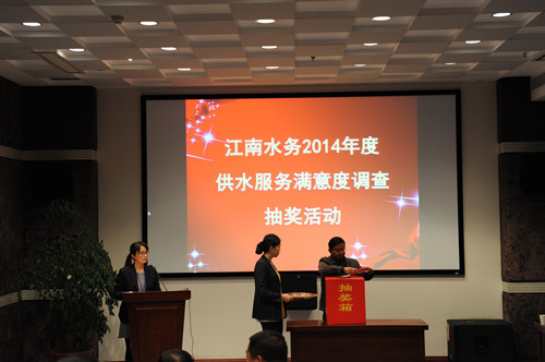 1月13日,在江阴市消费者协会的全程监督下,公司在13楼阶梯培训中心举行2014年度供水服务满意度调查抽奖仪式,从参与满意度调查活动的用户中共抽出一等奖1名、二等奖5名、三等奖50名。