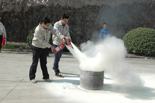 演练开始,公司安全监察部人员首先就干粉灭火器的特点及使用方法向参加演练人员进行了详细的讲解。接下来,参演人员两人一组,对事先准备好的火源实施灭火,参演人员快速跑向起火地点,手持灭火器瓶体轻摇几下,使筒内干粉松动,随后拔掉保险销,左手持瓶,右手提着压把,在距火焰两米左右的地方,右手用力压下压把,喷射干粉覆盖燃烧区,直至把火全部扑灭。灭火过程正确、迅速、有序,达到了预期要求。