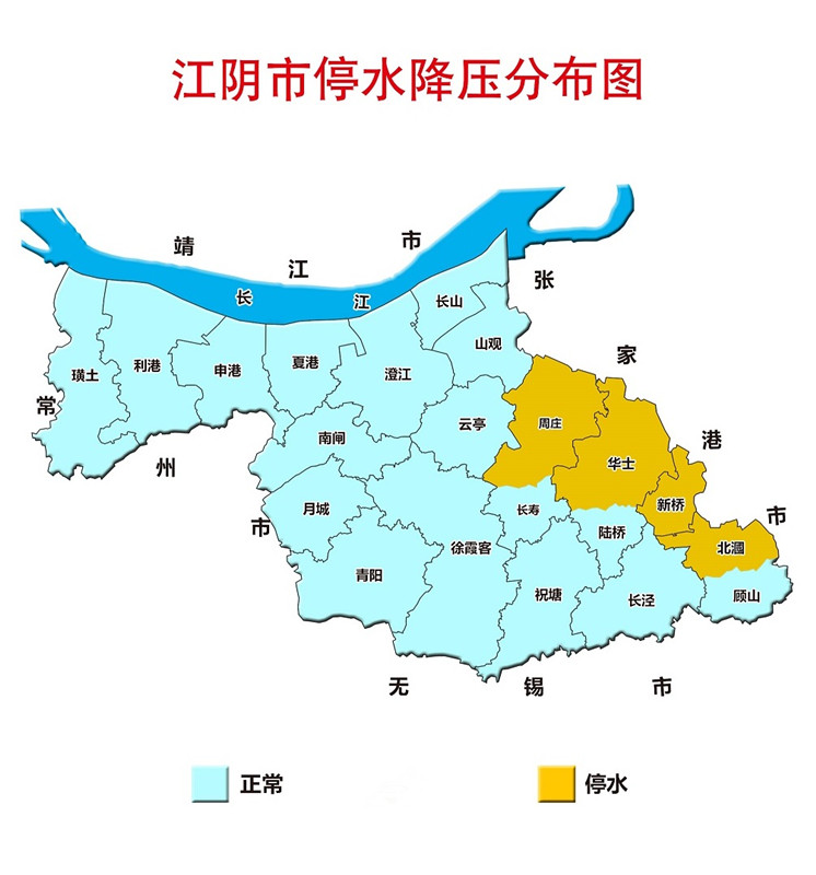 停水范围 :周庄镇(不包括长寿)、华士镇(不包括陆桥)、新桥镇和北漍社区所有用户停止供水。